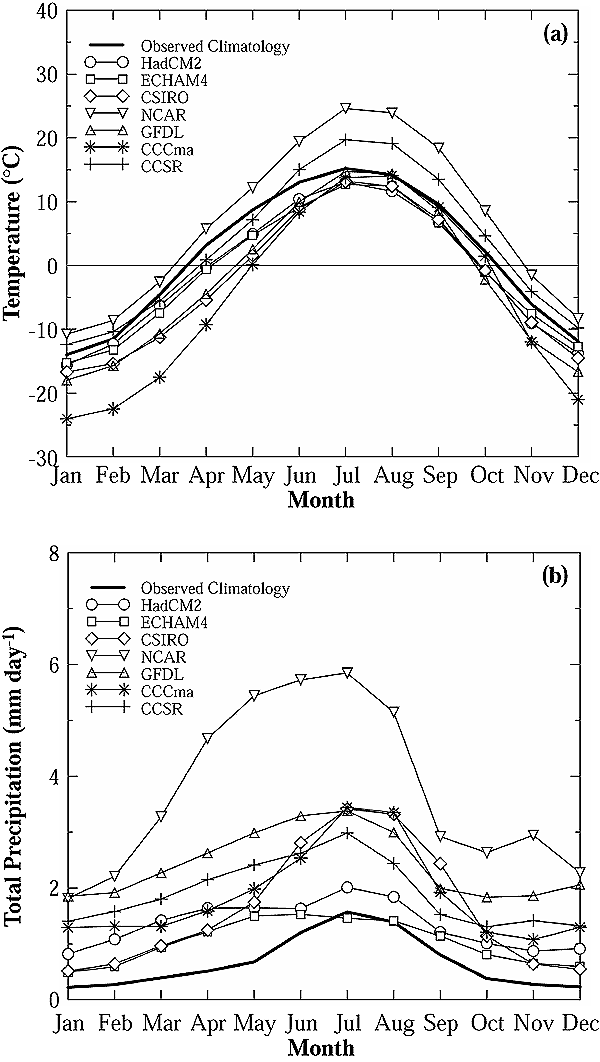 Validation of simulated and observed area-averaged annual cycles of surface air temperature (a) and precipitation (b) over Tibetan Plateau.