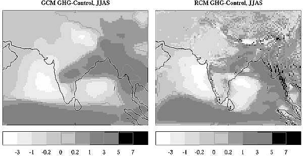 Spatial distribution of changes in monsoon rainfall over Indian subcontinent as simulated by Hadley Centre's global and regional climate models at the time of doubling of CO