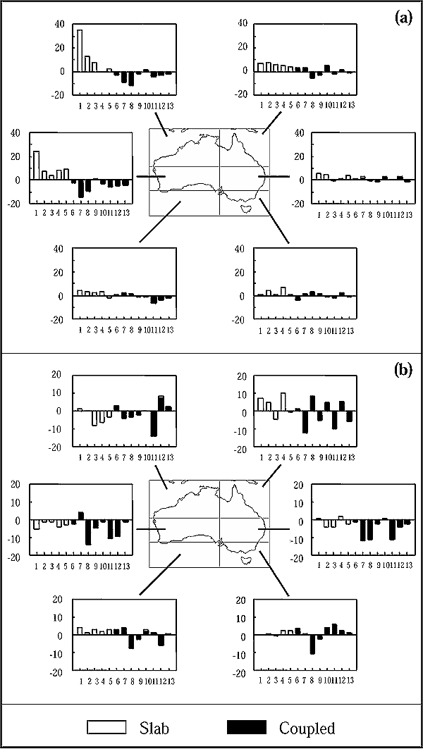 (full bars), for six subregions of Australia in (a) summer (DJF) and (b) winter