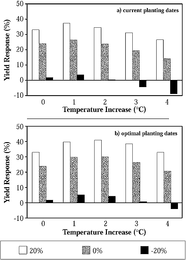 (to 700 ppm) and a range of changes in temperature and rainfall. Yield response