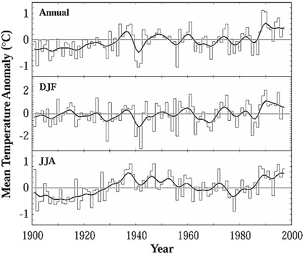 European annual mean temperature anomalies over land, 1901–1995, for the region 35°N to 75°N and 30°W to 50°E, with respect to 1961–90 mean. 10-pt filter applied. Data from IPCC Data Distribution Centre.