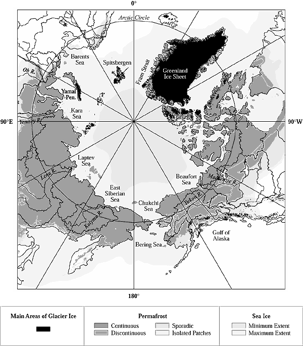 for the Arctic. Permafrost zonation, drainage basins, sea ice, and main areas