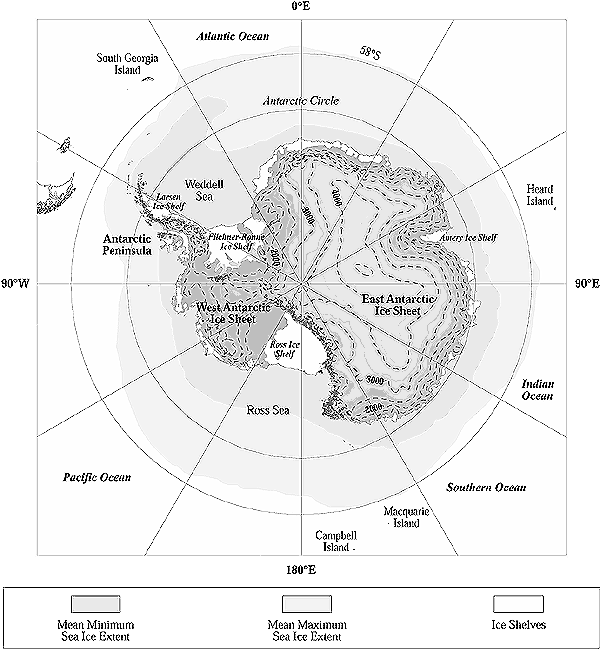 for the Antarctic. Elevations on Antarctic continent are indicated by dashed contour