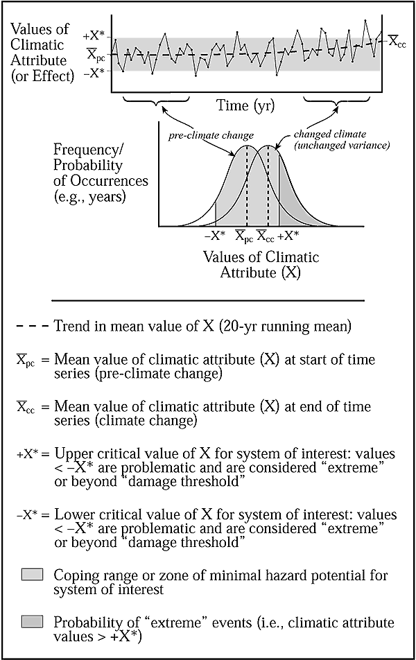 Climate change, variability, extremes, and coping range (after Hewitt and Burton, 1971; Fukui, 1979; Smit
