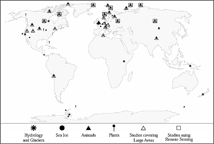 Sources: Hydrology and Glaciers, and Sea IceAmes and Hastenrath (1996), Cavalieri et al. (1997), Dettinger and Cayan (1995), Dowdeswell et al. (1997), Dyurgerov and Meier (1997), Greene et al. (1999), Groisman et al. (1994), Haeberli and Beniston (1998), Hastenrath (1995), Johannessen et al. (1999), Kaser (1999), Kratz et al. (2001), Magnuson et al. (2000), Maslanik et al. (1996), Rothrock et al. (1999), Schindler et al. (1990), and Vinnikov et al. (1999); Animals and PlantsBarber et al. (2000), Bergmann (1999), Bezzel and Jetz (1995), Bradley et al. (1999), Brown et al. (1999), Crick and Sparks (1999), Crick et al. (1997), Cunningham and Moors (1994), Dunn and Winkler (1999), Ellis (1997), Ellis et al. (1997), Fleming and Tatchell (1995), Forchhammer et al. (1998), Fraser et al. (1992), Gatter (1992), Grabherr et al. (1994), Hasenauer et al. (1999), Jarvinen (1994), Loeb et al. (1997), Ludwichowski (1997), Mason (1995), McCleery and Perrins (1998), Menzel and Fabian (1999), Pauli et al. (1996), Parmesan (1996, 2001), Parmesan et al. (1999), Post and Stenseth (1999), Post et al. (1997), Pounds et al. (1999), Ross et al. (1994), Sagarin et al. (1999), Slater (1999), Smith (1994), Smith et al. (1999), Sparks (1999), Thomas and Lennon (1999), Visser et al. (1998), Winkel and Hudde (1996, 1997), Zhou et al. (1995).