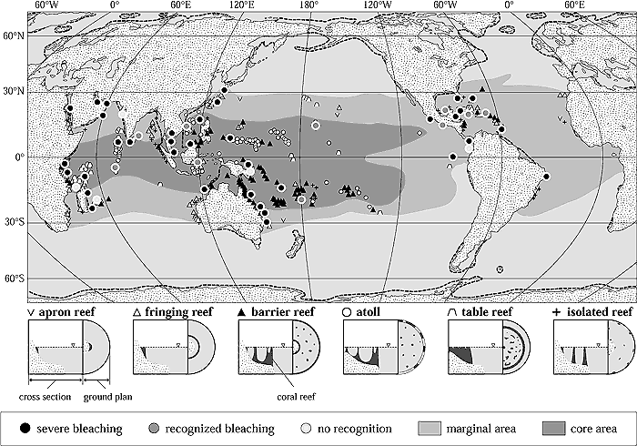 Bleaching of coral reefs reported from 1997 to 1998 (Mimura and Harasawa, 2000).
