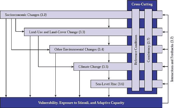 Types of scenarios required in climate impact, adaptation, and vulnerability assessment and their interactions. Numbers in parentheses refer to sections of this chapter.