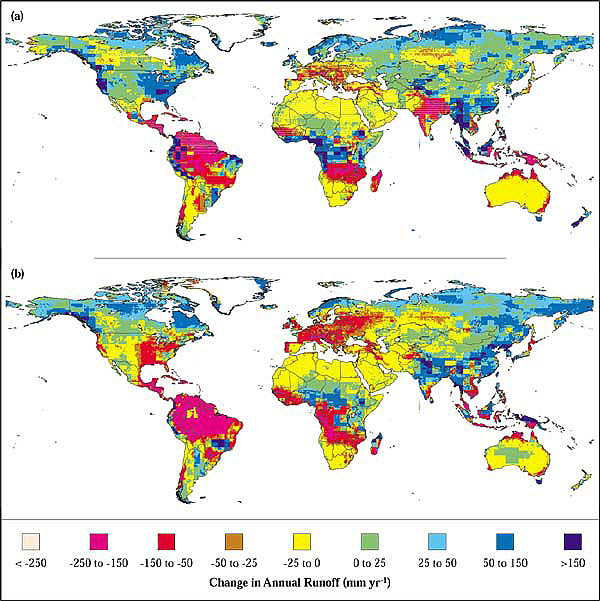 Change in average annual runoff by 2050 under HadCM2 ensemble mean (a) and HadCM3 (b) (Arnell, 1999b).