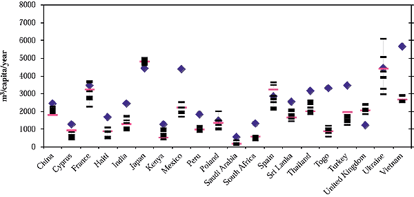 climate change scenarios, for some countries (Arnell, 2000). Blue diamonds represent