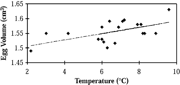 : Correlation between egg volume of the Pied Flycatcher over the years and mean air temperature (regression is significant at P<0.01).