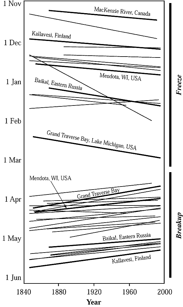 Historical trends in freeze and breakup dates of lakes and rivers in the Northern Hemisphere; 37 of the 39 trend slopes are in the direction of warming (modified from Magnuson et al., 2000).