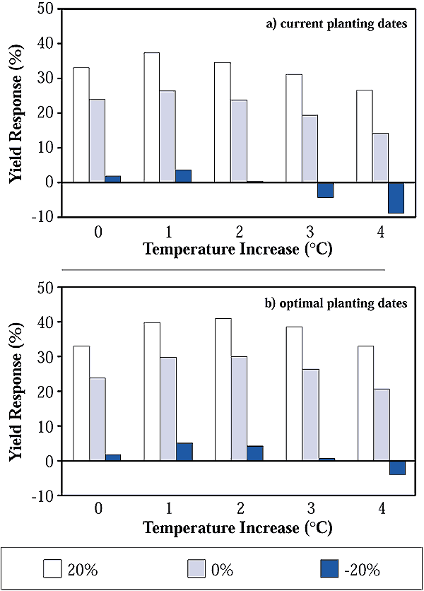 Figure TS-7: Percentage change in average annual total Australian wheat yield for CO2 (levels of 700 ppm) and a range of changes in temperature and rainfall: a) current planting dates, and b) optimal planting dates. Yield response is shown for rainfall changes of +20% (white), 0 (light blue), and -20% (dark blue), for warmings of 0-4ºC.