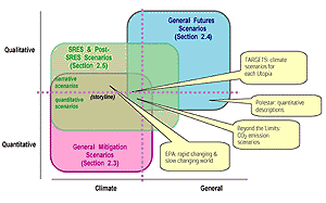 To account for the wide variety of possible futures and the large uncertainties involved in such forward projections, the SRES team opted for a multiple baseline approach.2 It also decided to fuse a qualitative, narrative approach with a more formal approach with different models, to guarantee structural variance and methodological diversity in the scenarios. As such, the SRES-scenarios combine elements from both the more story-like scenarios discussed in Section 2.4 below, and the more model-based scenarios discussed in Section 2.3. The relationship between these three kinds of scenarios is shown in Figure 2.1.