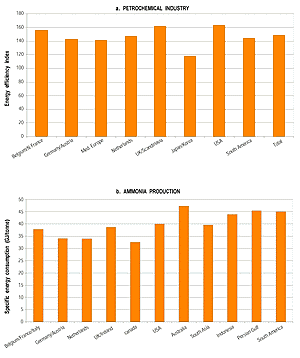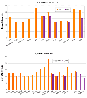 Differences in emission reduction potential are mainly caused by differences in specific energy consumption of industrial processes. In recent years attention was paid to developing methods to compare energy efficiency levels on a physical basis (Phylipsen et al., 1998a), in addition to methods that compare energy efficiency levels on a monetary basis (see, e.g., Schipper and Meyers, 1992). Energy efficiency indicators on a physical basis start from the level of energy consumption per unit of product (e.g., expressed in GJ/t). However, countries may differ in the production structure per sector (i.e. differences in product mix and associated differences in feedstocks used). Correction for such differences can take place by relating the specific energy consumption level for each product to a best practice level, resulting in a so-called energy efficiency index. The more efficient the aggregate of processes in a sector in a country, the lower the energy efficiency index. The energy efficiency indices are scaled in such a way that if all processes were operated at the best-practice level, the index would be 100.