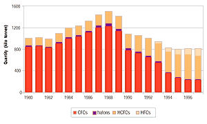 Both the quantities used and patterns of use of ODSs, HFCs, and PFCs are changing (see Figure A3.1) as ODSs are phased out under the Montreal Protocol (IPCC/TEAP, 1999; McFarland, 1999). In 1986, less than half of total ODS use was in insulating foams, fire protection, refrigeration, air conditioning, and heat pumps, with more than half as aerosol product propellants, non-insulating foam, solvent, and specialized applications. However, by 1997, the global consumption of fluorocarbons (CFCs, HCFCs and HFCs) had decreased by about 50% as solvent, aerosol product, and non-insulating foam applications switched to alternatives other than fluorocarbons. Refrigeration, air conditioning, and insulating foam accounted for about 85% of the remaining total fluorocarbon use. 80% of projected chlorofluorocarbon demand was avoided by reducing emissions, redesign, and use of non-fluorocarbon technologies. As CFCs, halons, and HCFCs are phased out globally, the quantities of fluorocarbons are expected to continue to decline in the short term, but are expected to grow in the longer term.