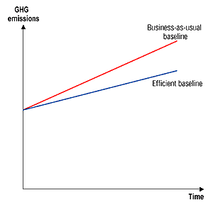 The different GHG emission profiles of the alternative baseline-scenario approaches depend on a number of assumptions. These include economic growth, mix of products, GHG emissions, intensity of energy production and consumption, and other material use. A business-as-usual baseline case is often associated with high GHG emissions, particularly if current main GHG emission sources, such as the energy industry, run at low efficiency. Such a baseline case can reflect the continuation of current energy-subsidy policies (which implies relatively high energy consumption and thereby high GHG emissions) or various other market failures of particular importance for GHG emission intensive sectors, such as capital market constraints. An efficient baseline case that assumes properly functioning markets, all other things being equal, can be expected to reflect relatively high energy efficiency and thereby lower GHG emissions than a business-as-usual baseline case. GHG emission profiles of the different baseline case approaches are illustrated in Figure 7.2.
