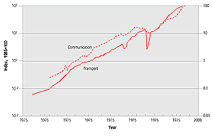 An information society based on a digital information network is sometimes projected to replace a substantial proportion of physical travel. However, historical data show that the telegraph and telephone did not affect the steady growth of transportation in France (see Figure 9.5). Mokhtarian et al. (1995) conclude that telecommuting, one aspect of the information society, does reduce transportation energy use. However, the reductions are smaller than often assumed, because they are partially offset by increased household energy use, and because some telecommuters do so only for part of their working day. Care must be taken in extrapolating future reductions from the limited case studies currently available; the behaviour of early-adapters may be different from that of later telecommuters. In the medium term, macro view, information technologies appear to be complementary to transportation (Gruebler, 1998); but in the longer term an information society could significantly replace travel and associated impacts, although this remains speculative.