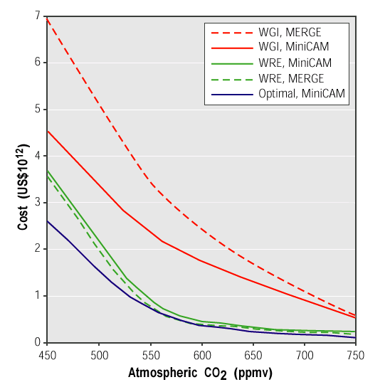 in the atmosphere at alternative levels from two studies. Costs are discounted