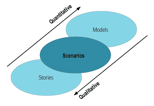 Schematic illustration of alternative scenario formulations ranging from narrative storylines to quantitative formal models (source: Nakicenovic et al., 2000).
