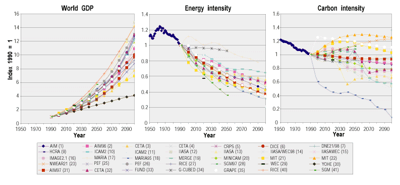 assumptions in GDP, energy intensity, and carbon intensity over the period 1990