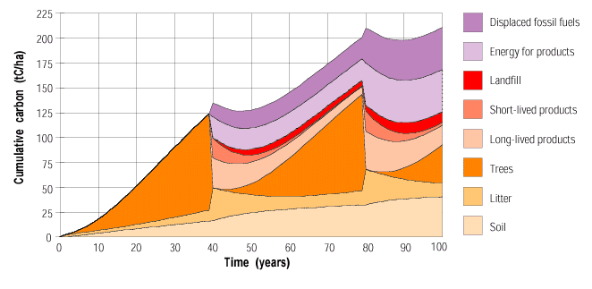 carbon changes for a scenario involving afforestation and harvest. These are net