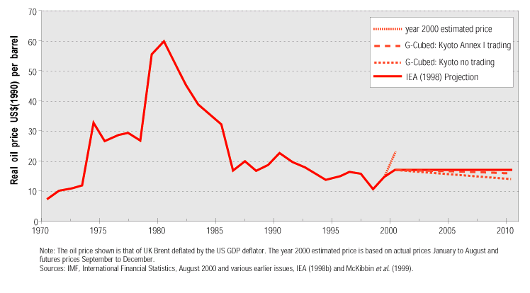 : Real oil prices 1970 to 2010 and the Kyoto target.